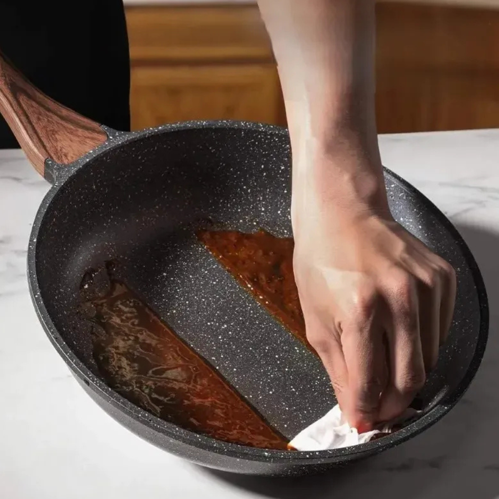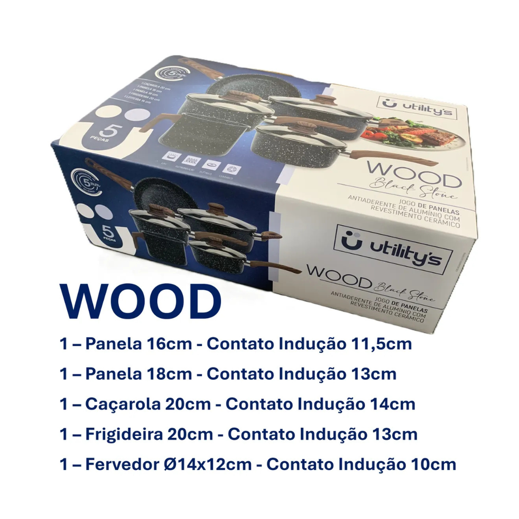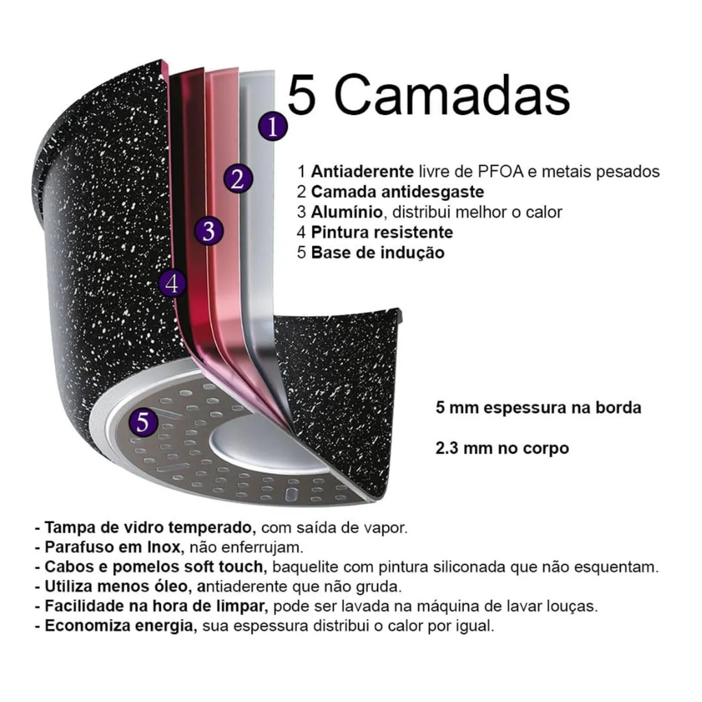Com espessura da borda de 5mm e 5 camadas de cosntrução, ele distribui o calor de forma uniforme e segura. Serve em todos os tipos de fogão, inclusive indução, e está disponível nos modelos Wood Black Stone (preto com toque granitico e cabos com temas amadeirados) e Vienna Stone Color ( magenta escuro com estilo europeu e cabos combinando com o conjunto).